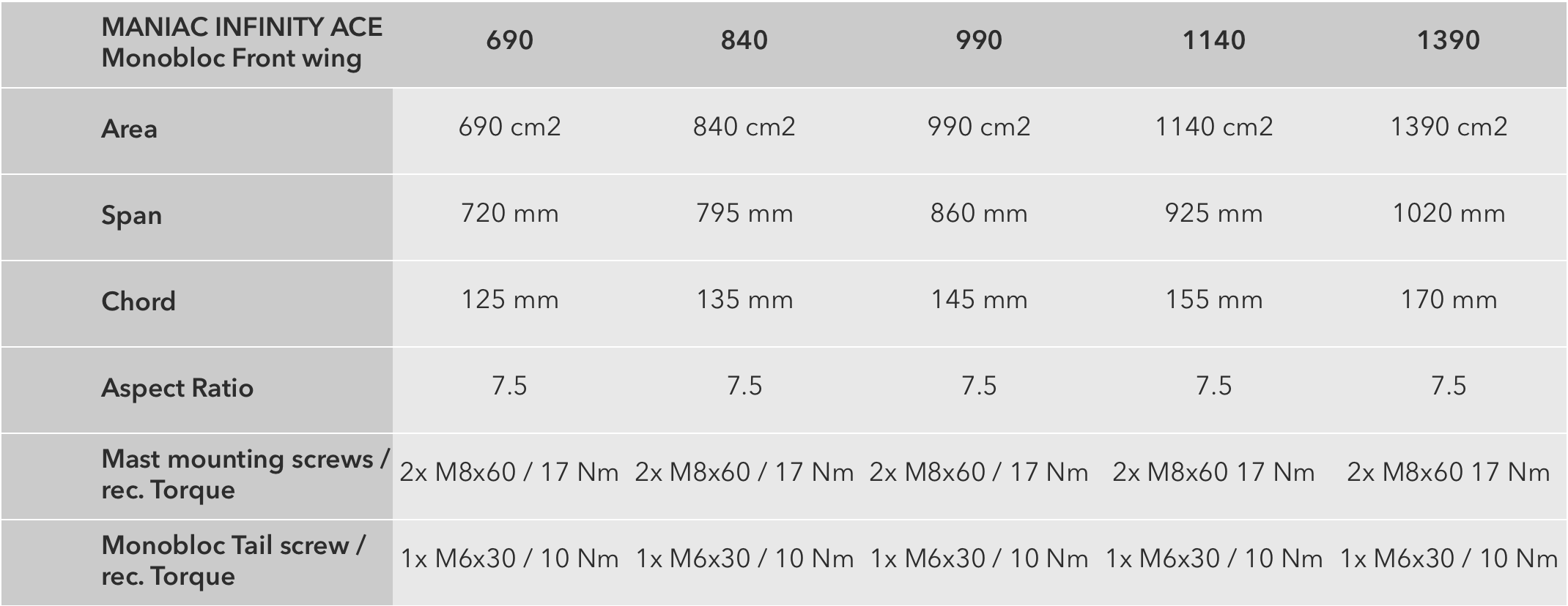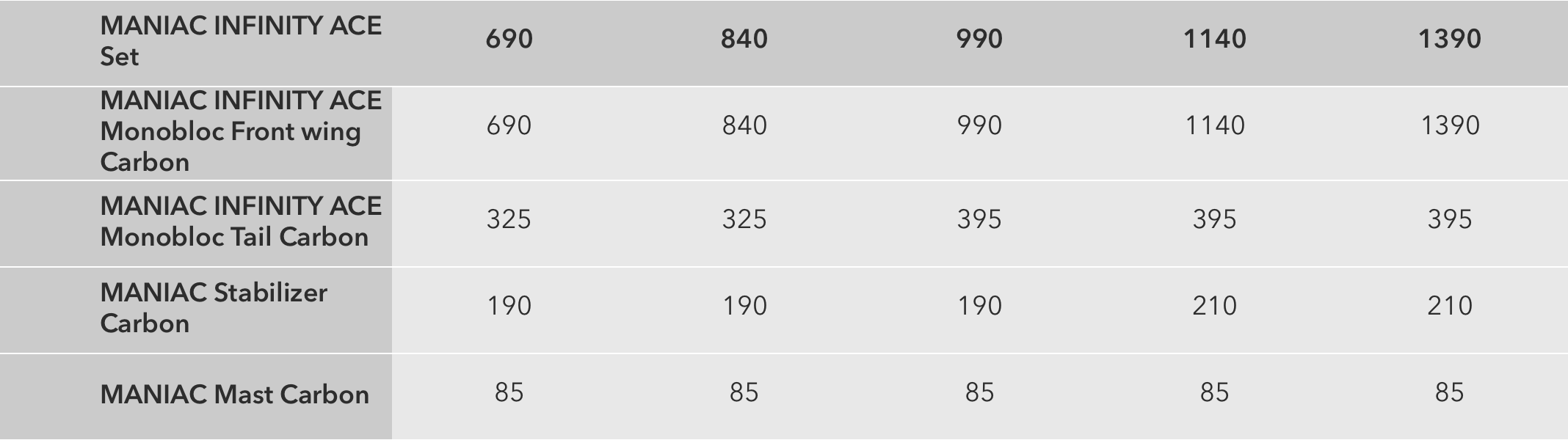 Das MANIAC INFINITY ACE ist in verschiedenen Größen verfügbar, von 690 bis 1390 cm², sodass du das perfekte Foil für dein Gewicht und deine Bedingungen findest. Die unterschiedlichen Größen bieten eine feine Abstufung und maximale Anpassungsfähigkeit, um bei jeder Session die beste Performance zu liefern.