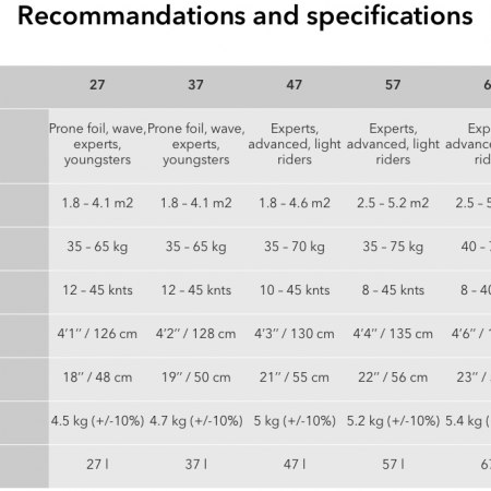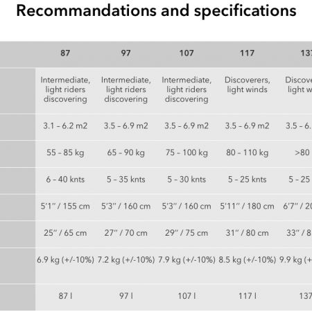 Das ENSIS Rock’n’Roll II ist in einer breiten Auswahl an Größen erhältlich – 27 L bis 167 L, abgestimmt auf unterschiedliche Fahrer-Gewichte, Einsatzbereiche und Windfenster.