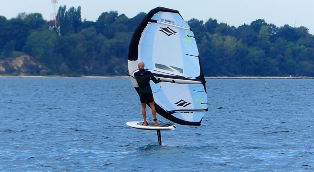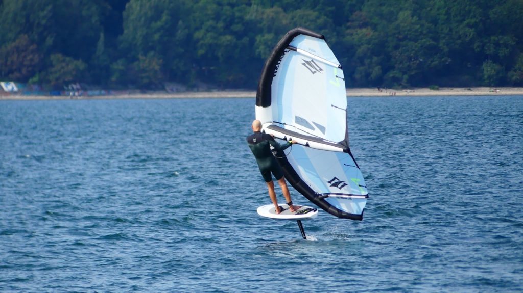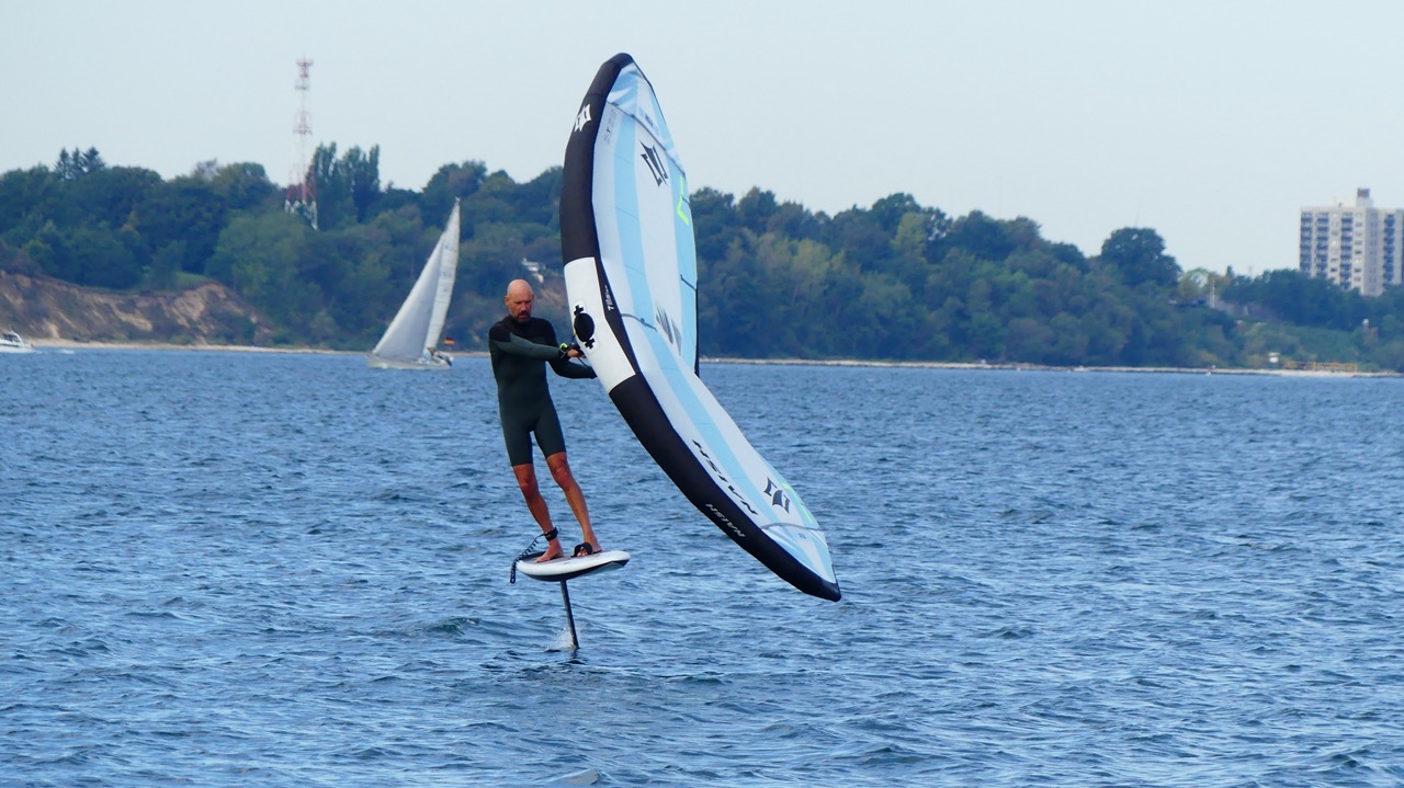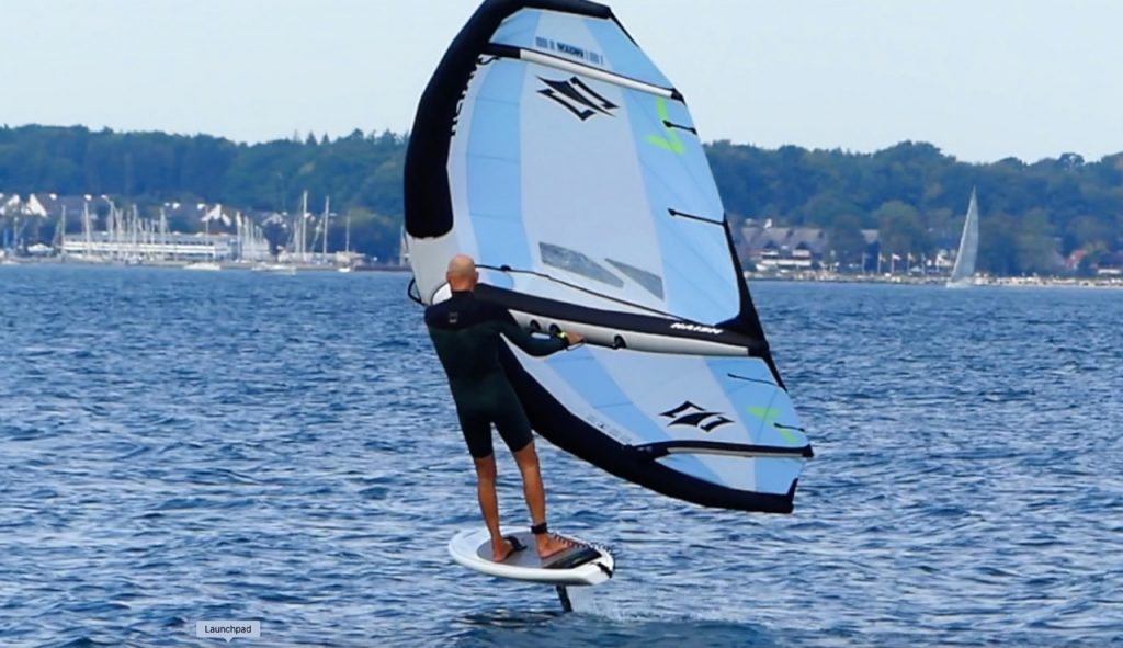 Bei Südwest Wind muß ich in Laboe ein Stück aus der Hafenabdeckung paddeln. Weiter Draußen erwische ich eine kleine Windböe. Ich falle mit dem Board etwas ab und nutze die Böe zum Anpumpen. Der Wing „federt“ und packt die Böe. Das „federn“ kann man in dem Video sehr gut erkennen. Ich falle etwas ab, das Midlenghs Board springt sofort an und bringt mich auf das Foil. Das ging noch viel schneller als gedacht. Swen sitzt auf dem Anleger und schießt ein paar Aufnahmen, während ich die Session im Shorty Neopren und zwischen den Segelbooten genieße.
