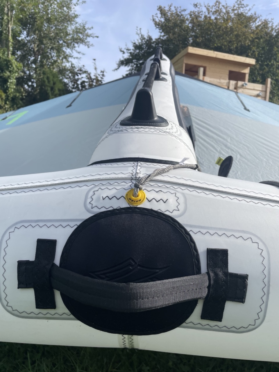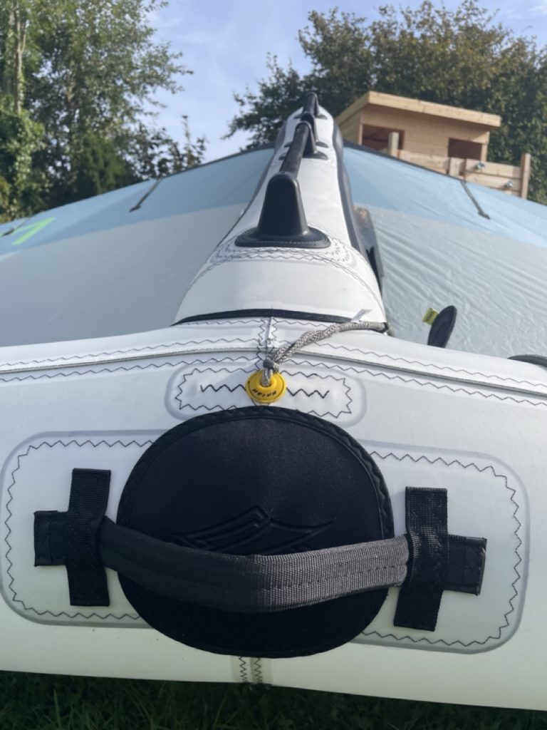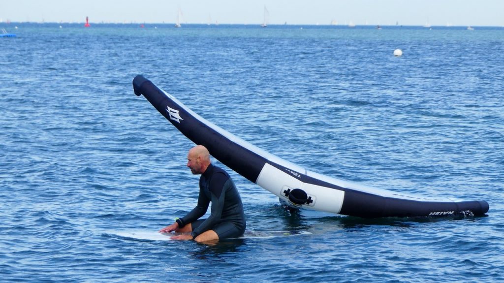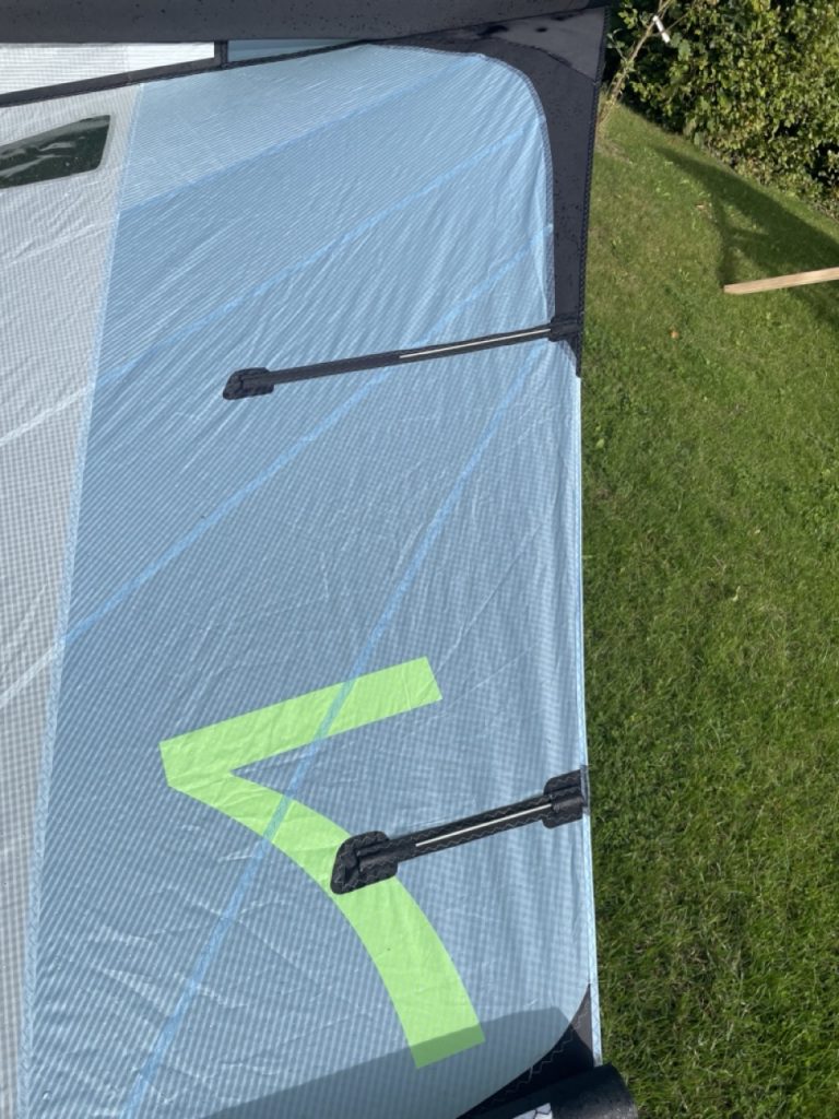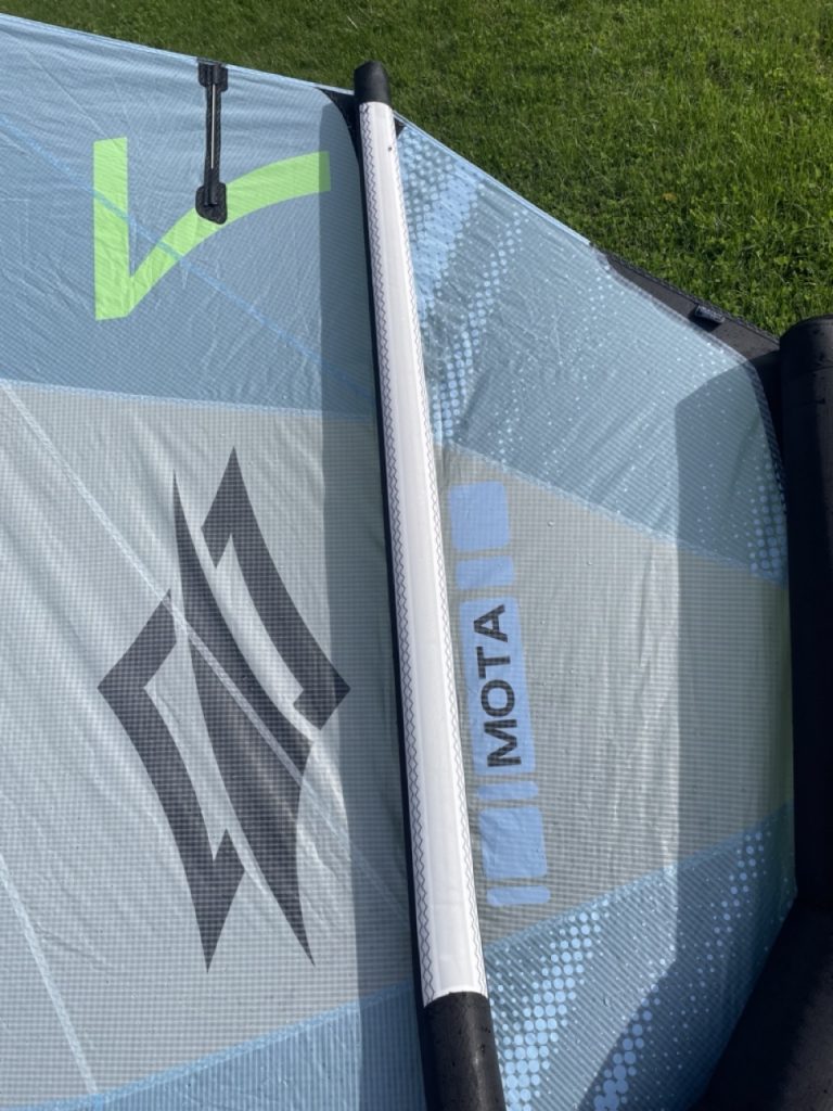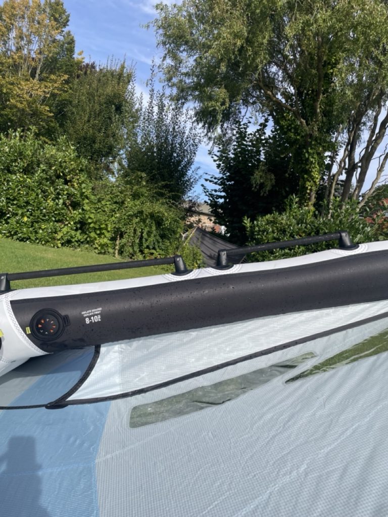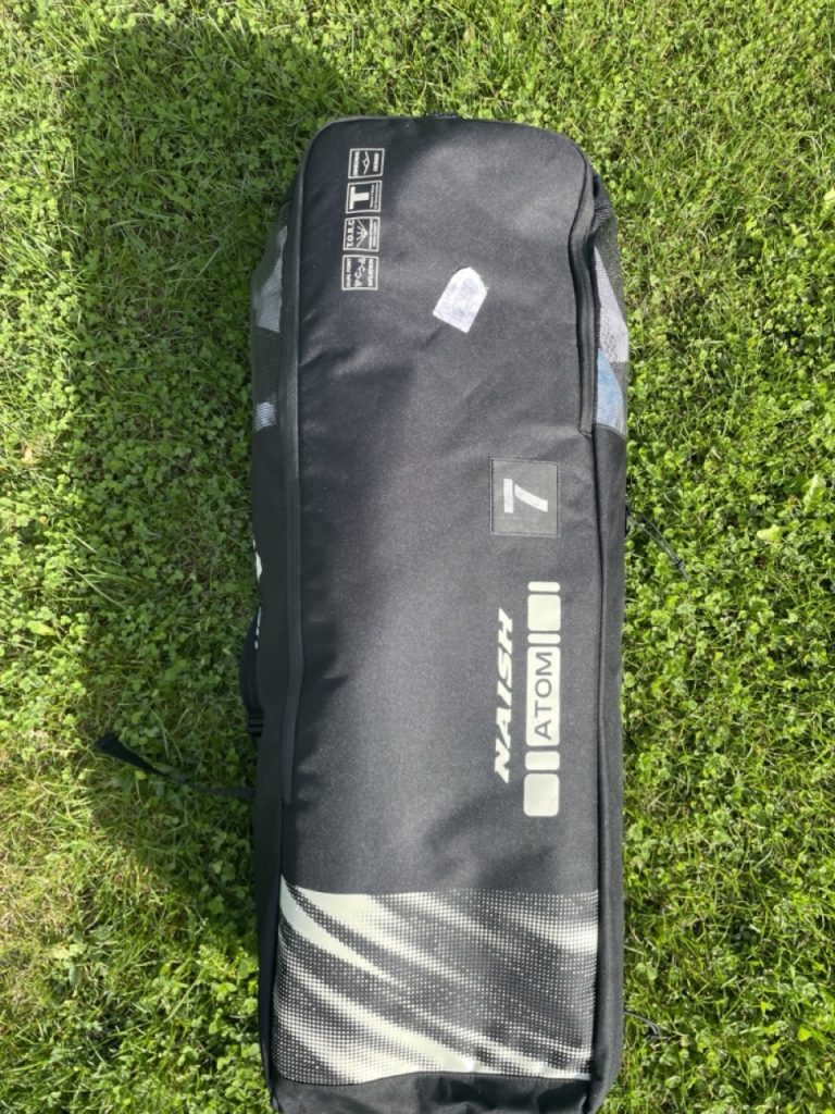 Der neue Naish Atom in 7 qm macht schon beim Auspacken Eindruck. Er wirkt „riesig“. Im Lieferumfang ist eine Leash und ein Adapter für die Pumpe dabei und schon ist er aufgepumpt. Zuerst fällt mir das 3-Strut-Design auf. Links und rechts vor den Tips sind 2 weitere Struts eingesetzt, die von der Fronttube aus mit Luftdruck versorgt werden. Außerdem gibt es 4 Segellatten und 2 Naish SUP Ventile an der Fronttube und an der Mittelstrut. Passend zu einem Leichtwind Tag wähle ich das neue Naish Chimera Midlenghts Board in 6.1 (78 Liter) und einen 1.000er HA Jet Foil.