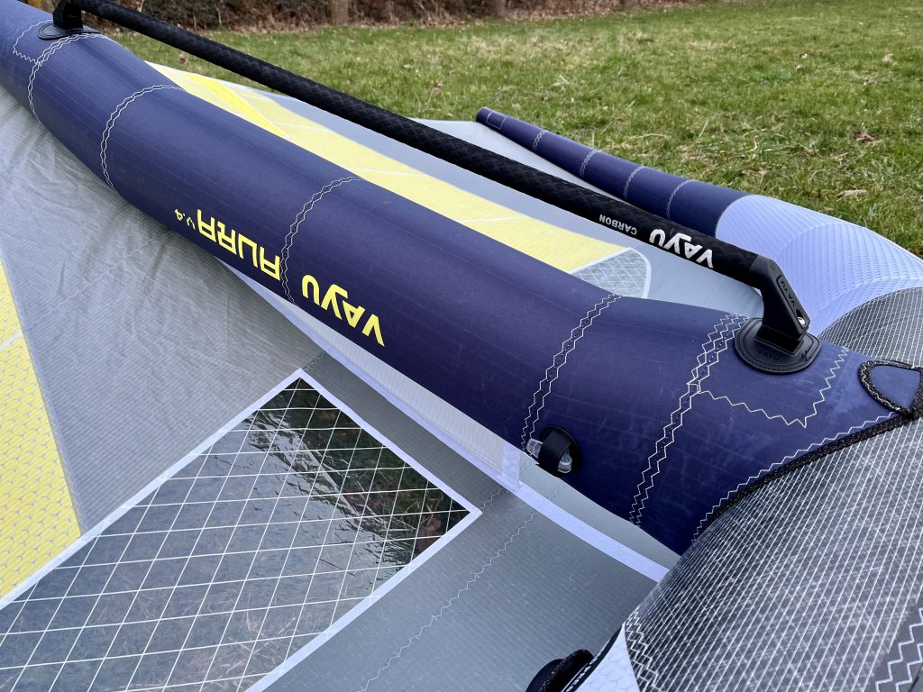 Aufgepumpt wird der Vayu Aura 4 über ein SUP‑Ventil an der Fronttube. An der Middlestrut gibt es zusätzlich ein separates „Luftmatratzen“-Ventil, über das beim Abbauen die Luft besonders leicht entweichen kann.