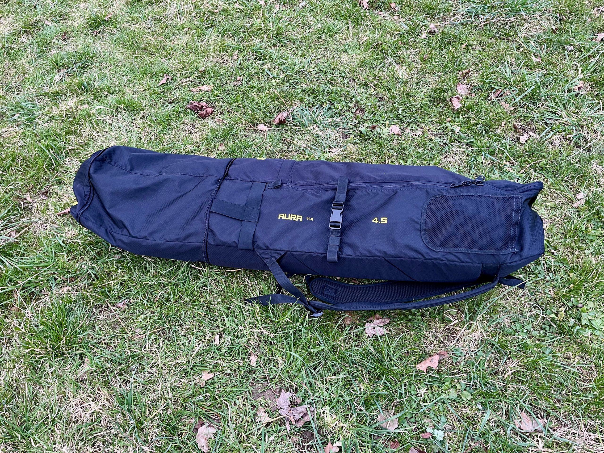 Die Tasche ist als Rucksack ausgeführt und besitzt an beiden Schulterriemen eine Verstärkung bzw. Rille, auf der man beim Transport das Foil ablegen kann. Seitlich gibt es außerdem eine Möglichkeit, die Pumpe zu befestigen. Durch einen Reißverschluss am Boden lässt sich der Rucksack verlängern, sodass der Wing auch mit montiertem Boom hineinpasst.