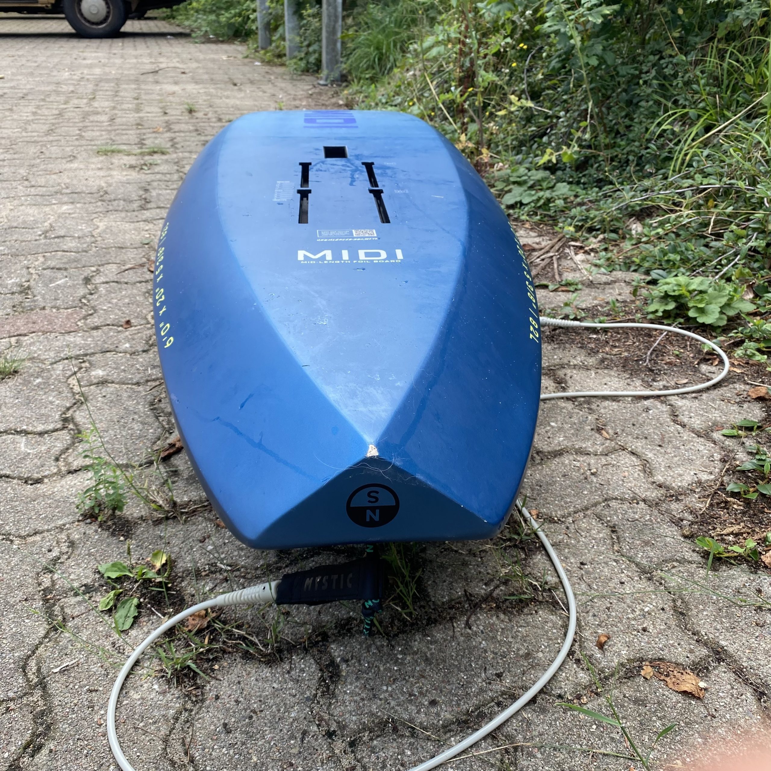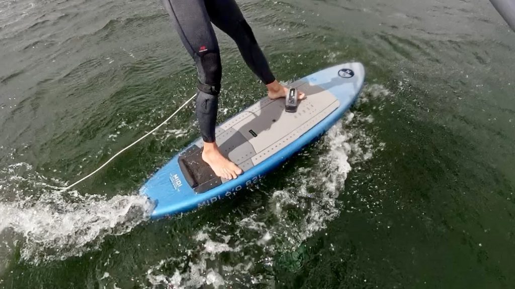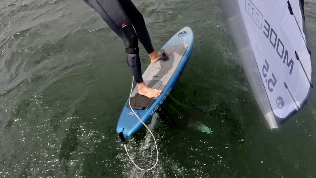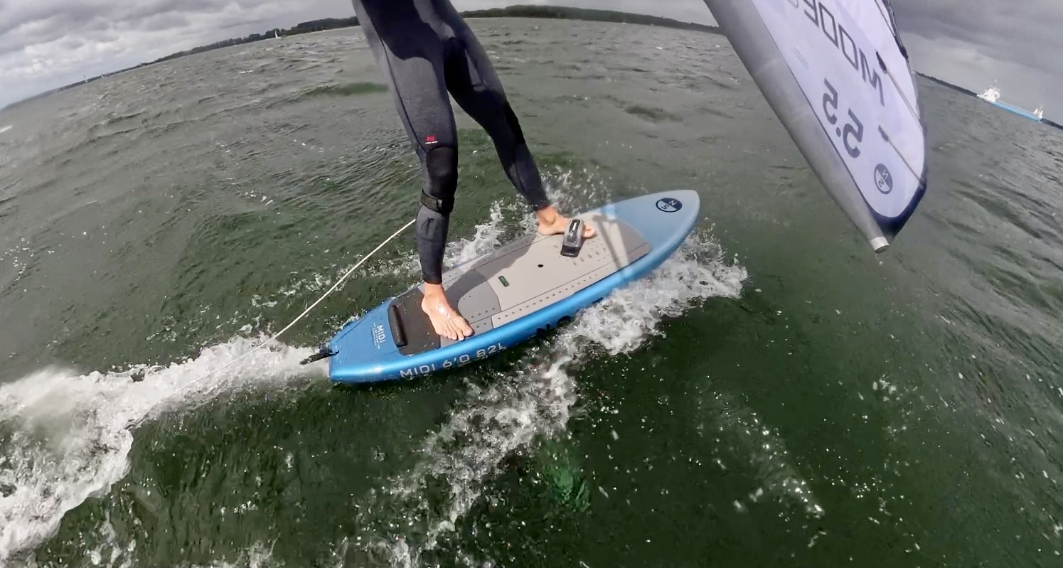 Dennoch: Ein Leichtwind-Wunder im passiven Sinn ist das Midi nicht. Wer hofft, darauf ohne Pumpen einfach herumzustehen bis es foilt, wird enttäuscht. Die schmale Standfläche verlangt auch bei wenig Wind Balance und saubere Technik. Im Vergleich zu einigen breiteren Lightwind-Boards fühlt sich das Midi vor dem Abheben doch deutlich nervöser an. Übrigens ein Grund, weshalb wir uns wie im Bild zu sehen vorn eine Fußschlaufe angebaut haben. Damit ließ sich das Board deutlich leichter kontrollieren und belohnte prompt mit einem frühen Take-Off. Für absolute Low-Wind-Einsteiger sind breitere Shapes zu empfehlen. Fortgeschrittene Fahrer können mit dem Midi ihre Leichtwind-Reichweite tatsächlich erweitern, da es effizient gleitet und dadurch mit kleinerer Wing-Größe oder einem kleineren Foil auskommt, wo man sonst mehr Fläche bräuchte. Die Devise lautet: Aktiv fahren. Wer das tut, wird feststellen, dass das Board kaum Widerstand leistet und blitzschnell auf dem Foil ist.