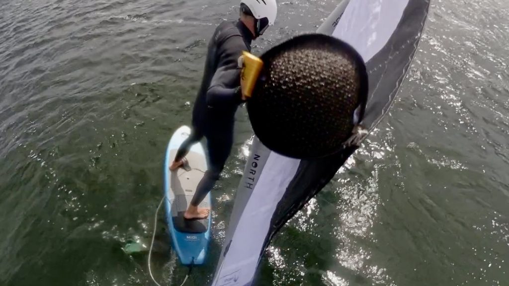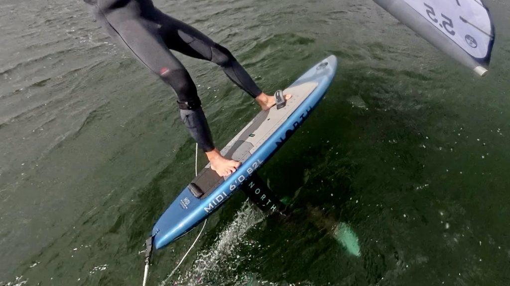 Wie schlägt sich das North Midi 6’0’’ nun im Praxiseinsatz? Zunächst die wohl spannendste Frage: Wie schnell kommt man damit ins Foilen? Dank des langen, schlanken Shapes lautet die Antwort: Sehr schnell. Sobald man ein paar Paddel- oder Wing-Schläge gemacht hat und Fahrt aufnimmt, spürt man die geringe Wasserreibung – das Board beschleunigt zügig. Im Vergleich zu breiteren Boards gleicher Größe braucht das Midi tatsächlich weniger Kraft, um auf Tempo zu kommen. Bereits bei überraschend wenig Wind gleitet es an. Bei ca. 12 Knoten und einem 5.5 m2 Wing war das Abheben ein Kinderspiel – zumindest in Verbindung mit etwas aktiverer Fahrtechnik – ein paar kräftige Pumpbewegungen mit Wing und Foil, und das Midi schießt förmlich aufs Foil. Zugleich blieb das Board auch bei viel Wind mit Böen bis zu 30 Knoten noch gut kontrollierbar und das Board bot für unser Gefühl nicht zu viel Wind-Angriffsfläche.