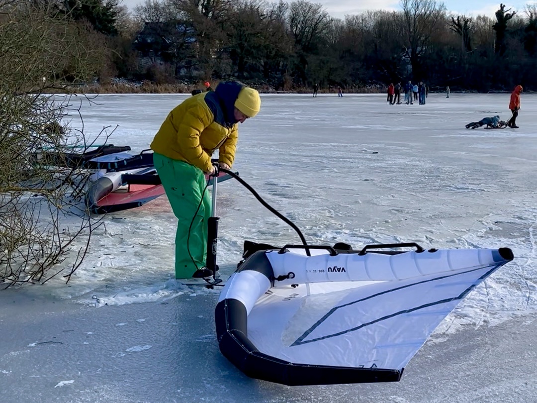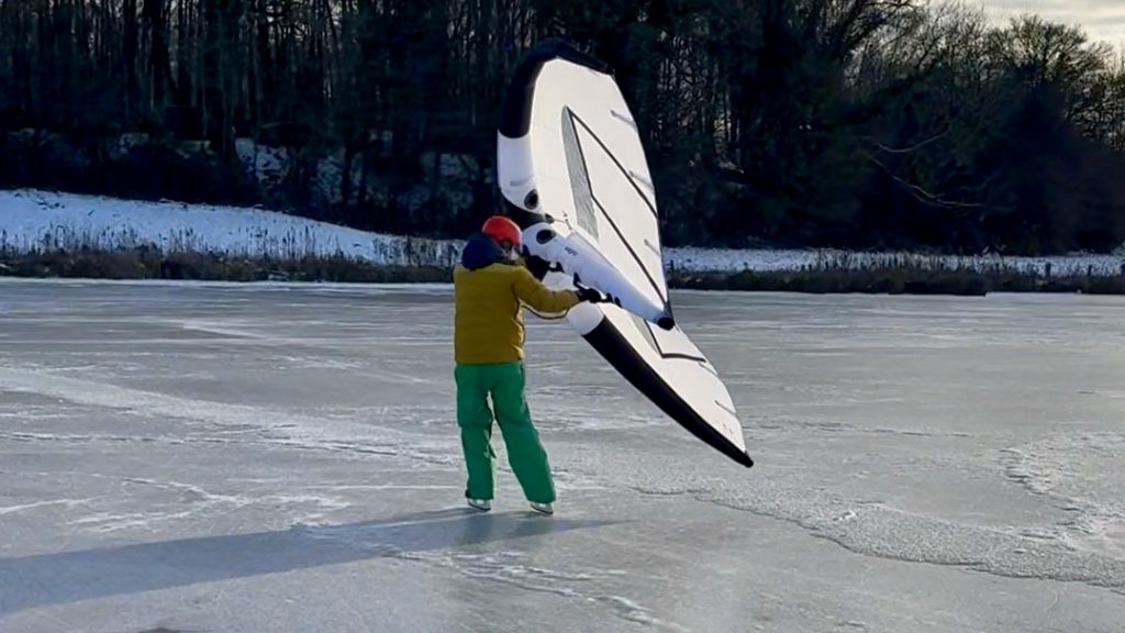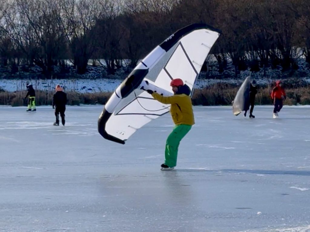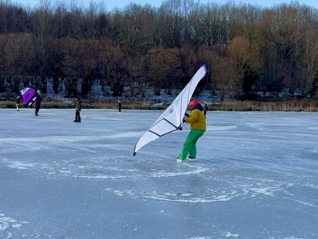 Was sich auch bemerkbar macht, dass Wingfoilen aus der Region Kiel so schnell nicht mehr verschwinden wird. Teilweise waren 10 Wings und mehr auf dem Eis unterwegs. Bei so viel Trubel auf dem Eis musst man die anderen Winger und vor allem die „normalen“ Schlittschuhfahrer/-inen immer im Blick behalten, um niemanden über den Haufen zu fahren. Ein Helm konnte auf jeden Fall nicht schaden.