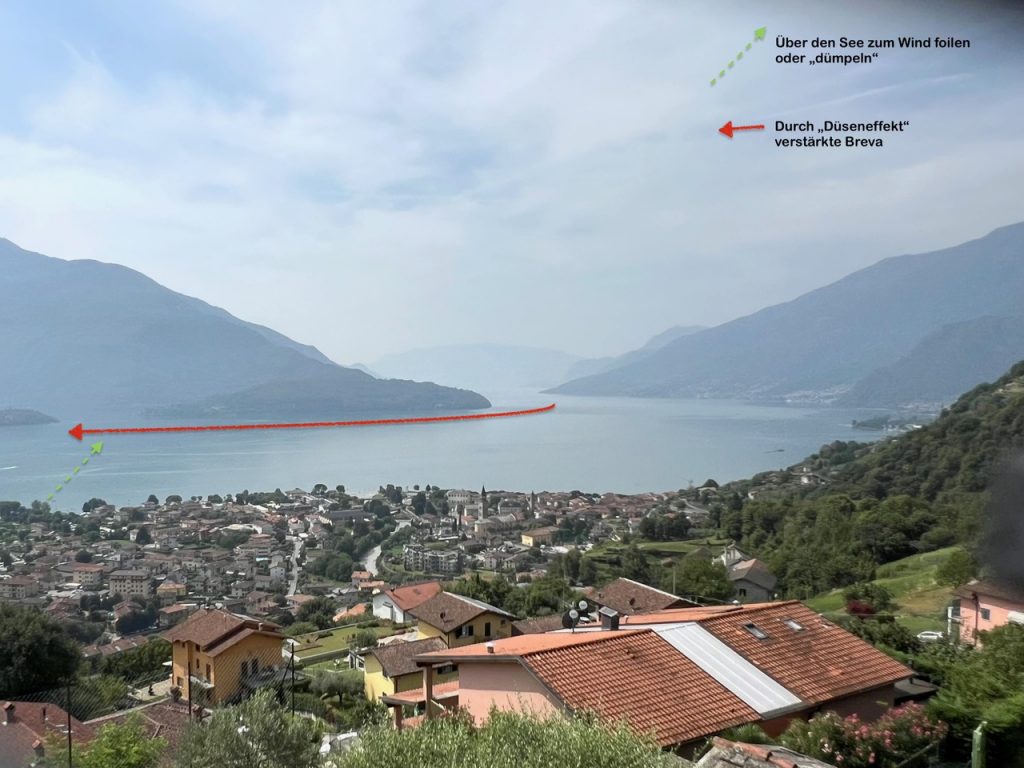 Den entscheidenden Tipp bekam ich gleich am ersten Tag. Direkt am Strand von Domaso kräuselt sich das Wasser ein wenig und man denkt, es reicht nicht zum Foilen. Doch auf der anderen Seeseite vor der Halbinsel Piona weht es deutlich stärker und man entdeckt schnell kleine Schaumkronen auf dem Wasser. Schafft man es mit einer frühen Böe aufs Foil empfiehlt es sich die knapp 1,5 km auf die andere Seeseite zu foilen. Dort hat man dann stärkeren Wind. Gegen 17 Uhr verlagerte sich die Windzone an einigen Tagen dann auf die Domaso-Seite und man konnte entspannt vor dem eigene Strand foilen.