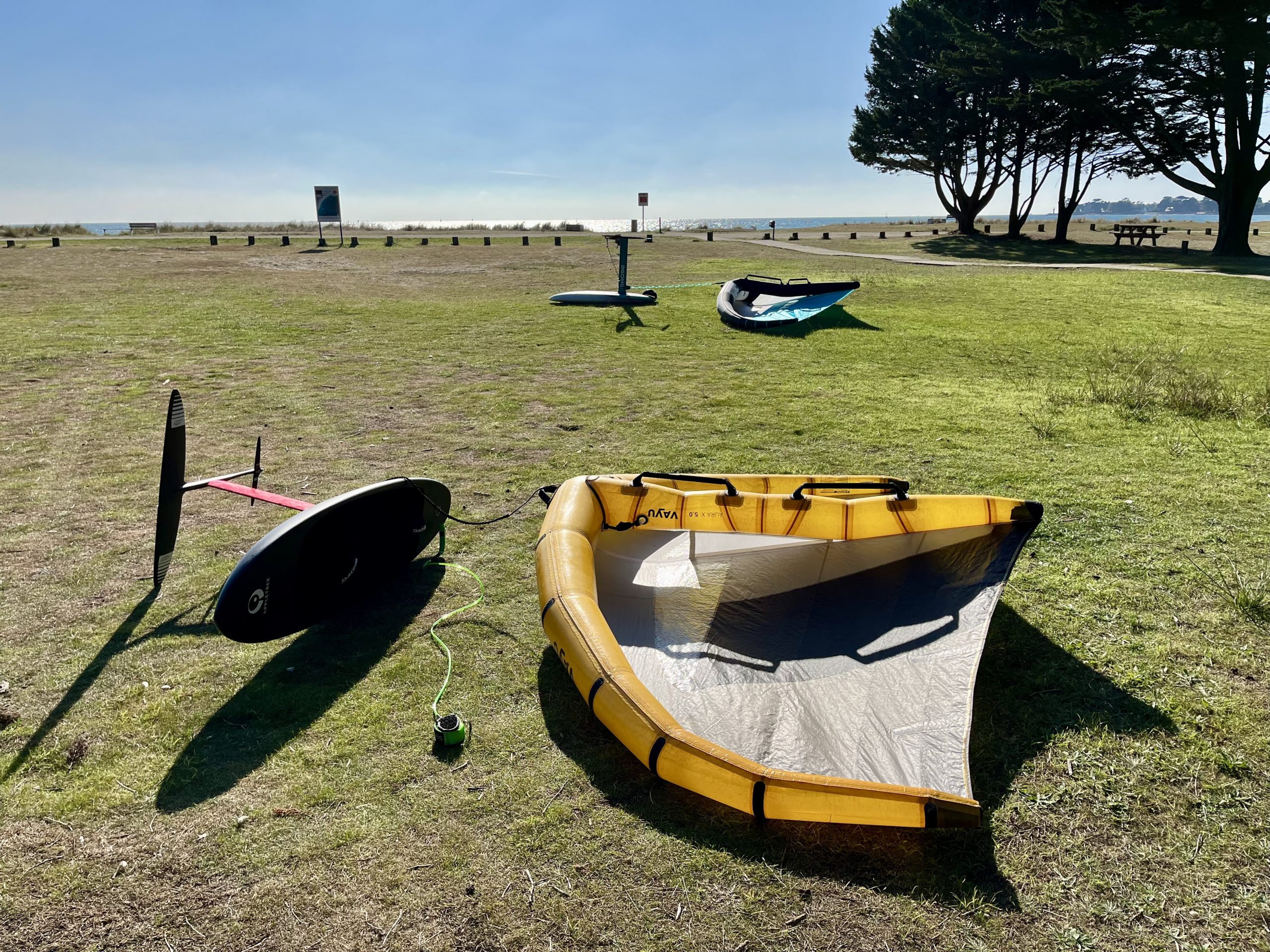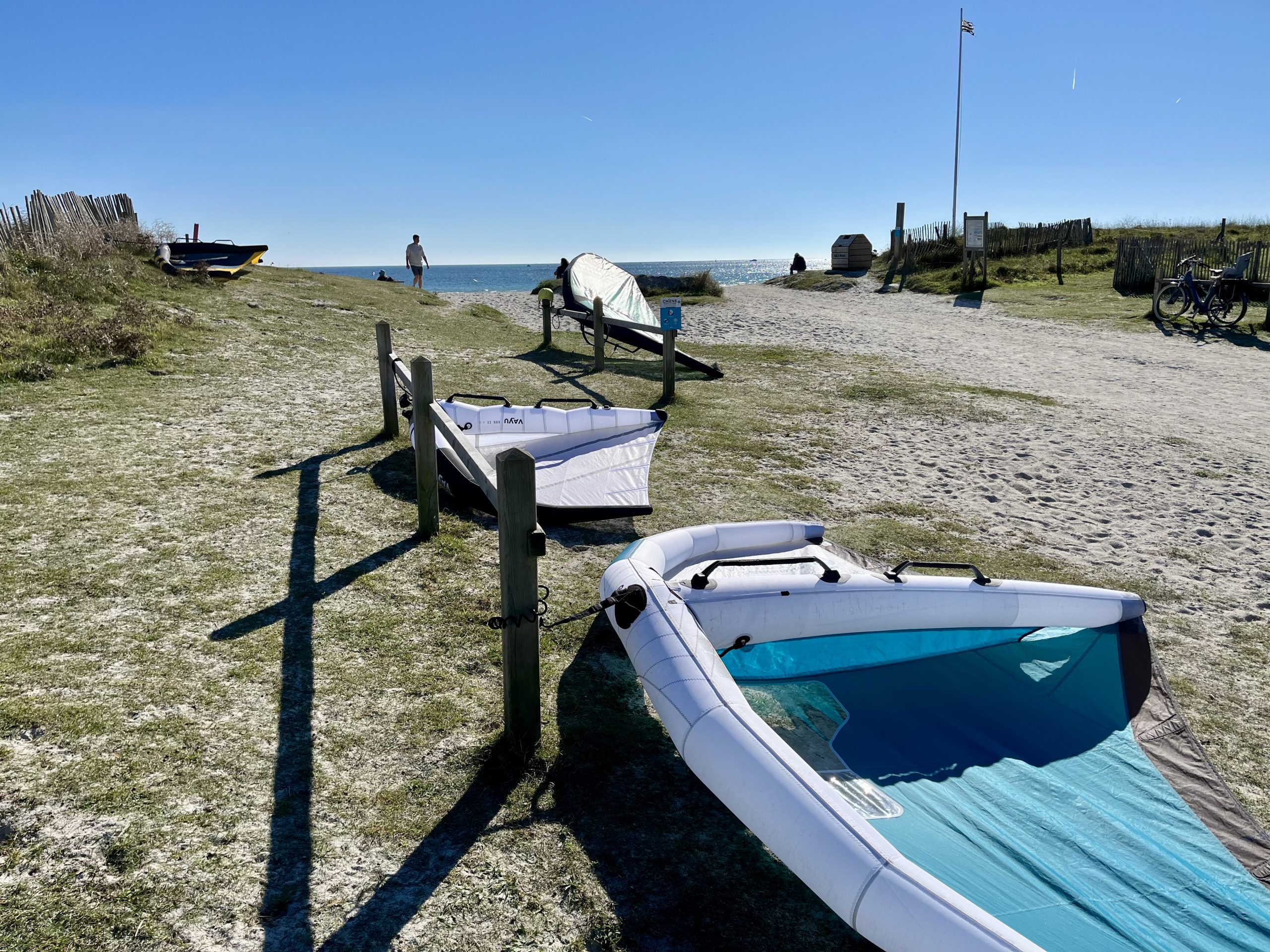 Geparkt wird direkt hinter der kleinen Düne. Ein Teil des Parkplatzes ist auch für Fahrzeuge zugänglich, die Höher als 1,9 m sind. Das Stehen über Nacht ist aber ausdrücklich untersagt und wird wohl auch geahndet. Es gibt sogar ein Toilette. Aufgebaut werden die Wingfoil-Sachen auf einer kleinen Rasenfläche. Hier kann man in der Nebensaison die Fahrradständer hervorragend als Wing-Halter nutzen.