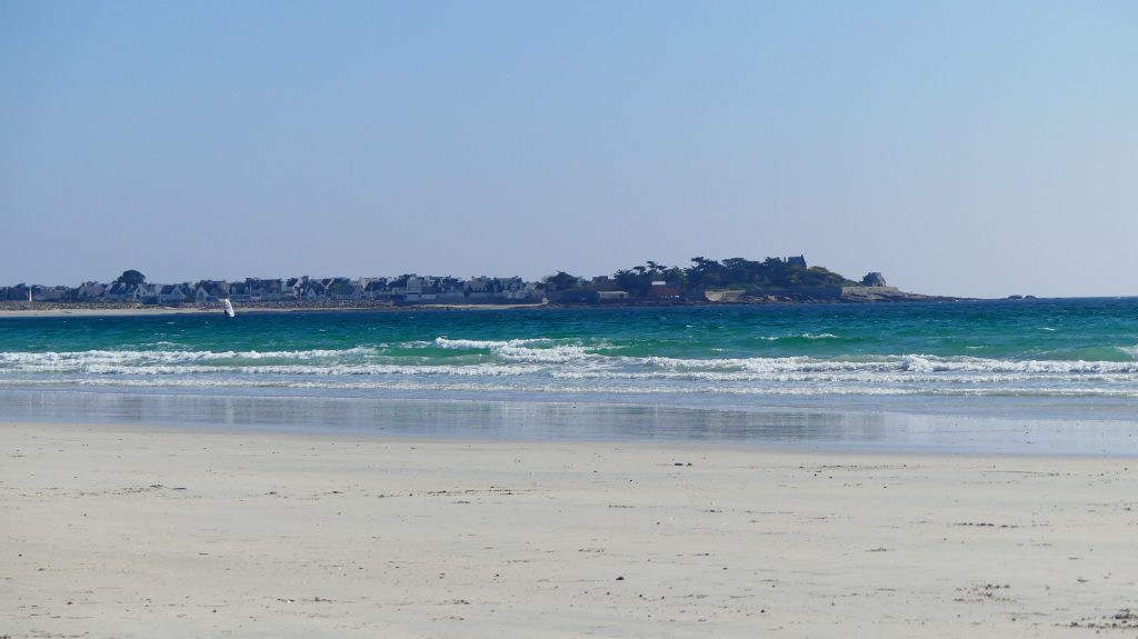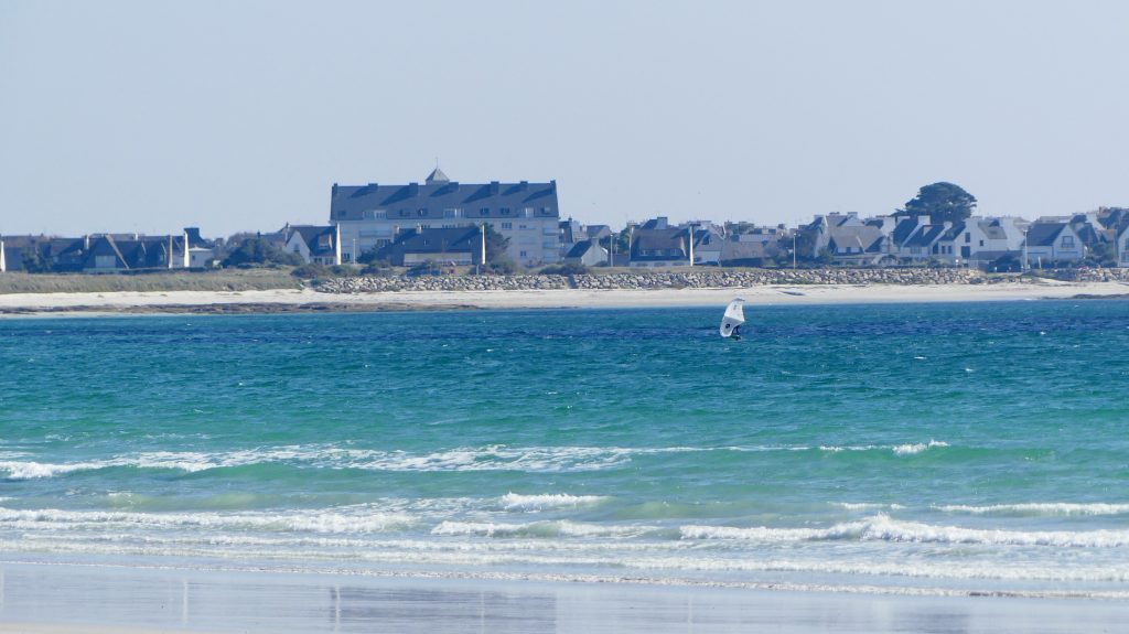 Südöstlich von Penmarch liegt der Plage du Stêr. Es ist der erste Sandstrand der nach Süden hin ausgerichteten Küste. West- und Ostwinde kommen hier genau sideshore. SW und SO weht sideon. Hier gibt es in der Regel keine große Wellen. Der Strand profitiert davon, dass er westlich von Riffen eingerahmt ist, die den Atlantik-Swell abhalten. Zu allen Tidenständen kann man hier aufs Wasser. Der einzige Unterschied besteht darin, dass der Weg über den Strand mal länger oder mal kürzer ist. Man muss nur ein paar Meter ins Wasser gehen und es tief genug, um aufs Foil zu steigen. Auf dem Wasser bildet sich eine kleine Windwelle, die aber nicht weiter störend ist. Das Wasser ist teilweise türkisblau. In Kombination mit dem hellen Sandstrand könnte man auch sich auch in der Karibik wähnen.